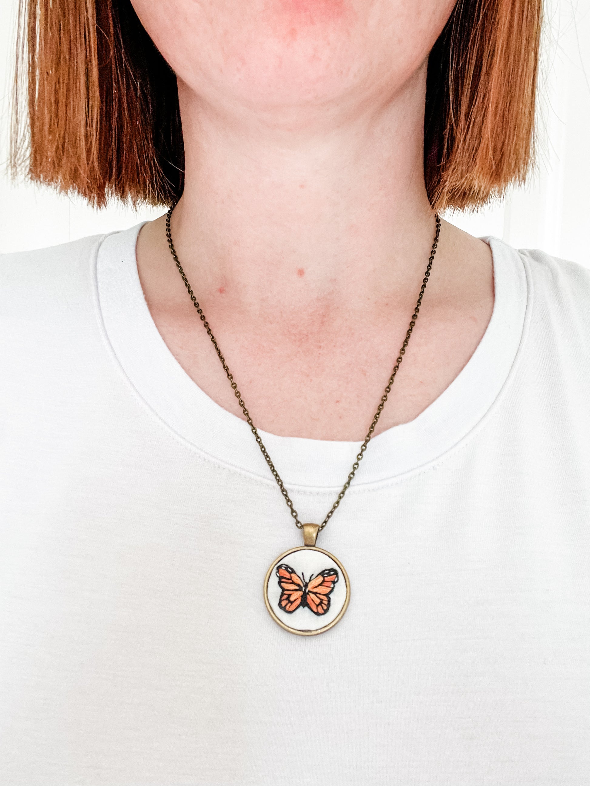25 mm pendant on a 20 inch metal chain necklace. This item is handmade and unique, and as such any small imperfections are a part of its charm.