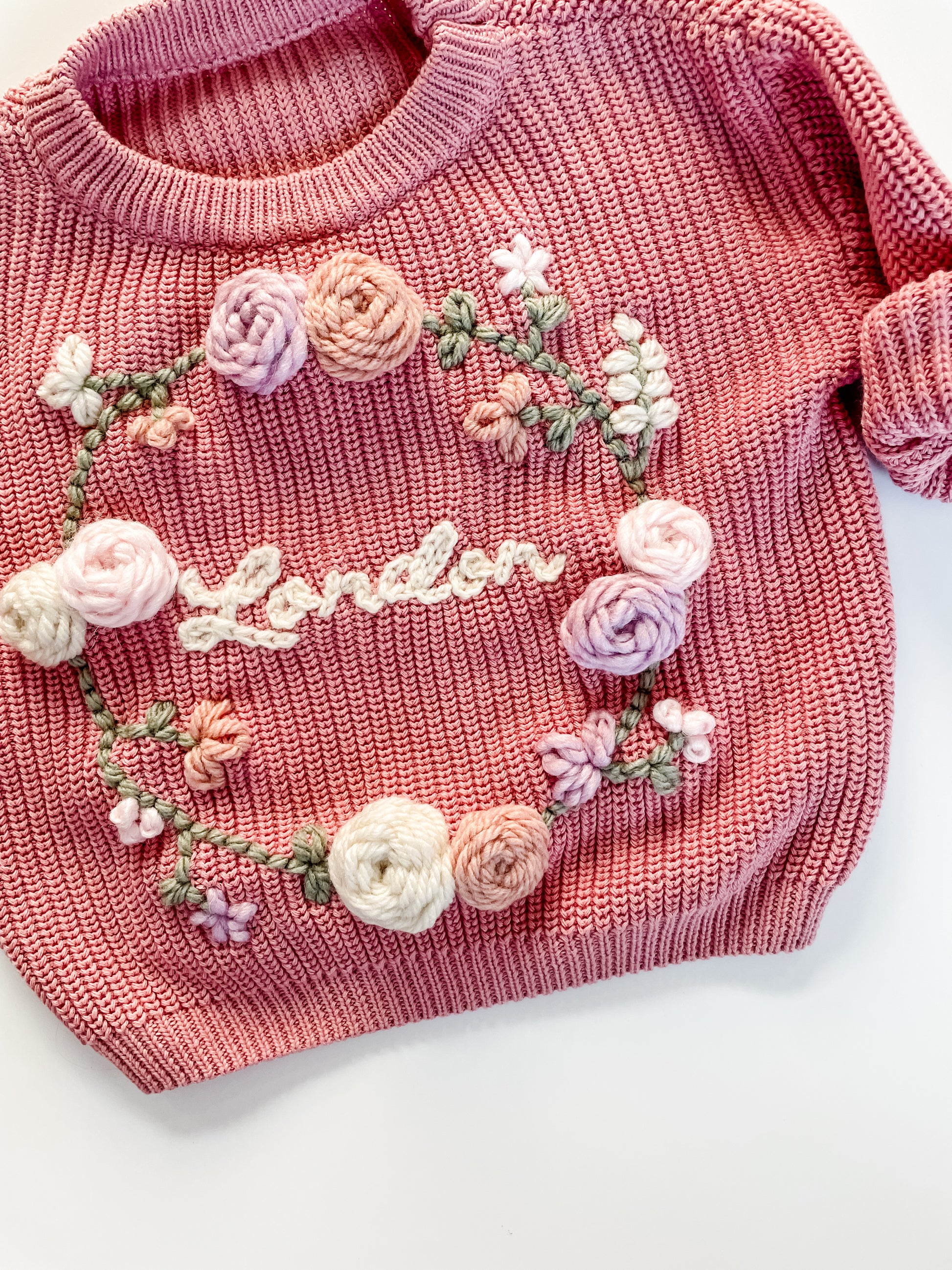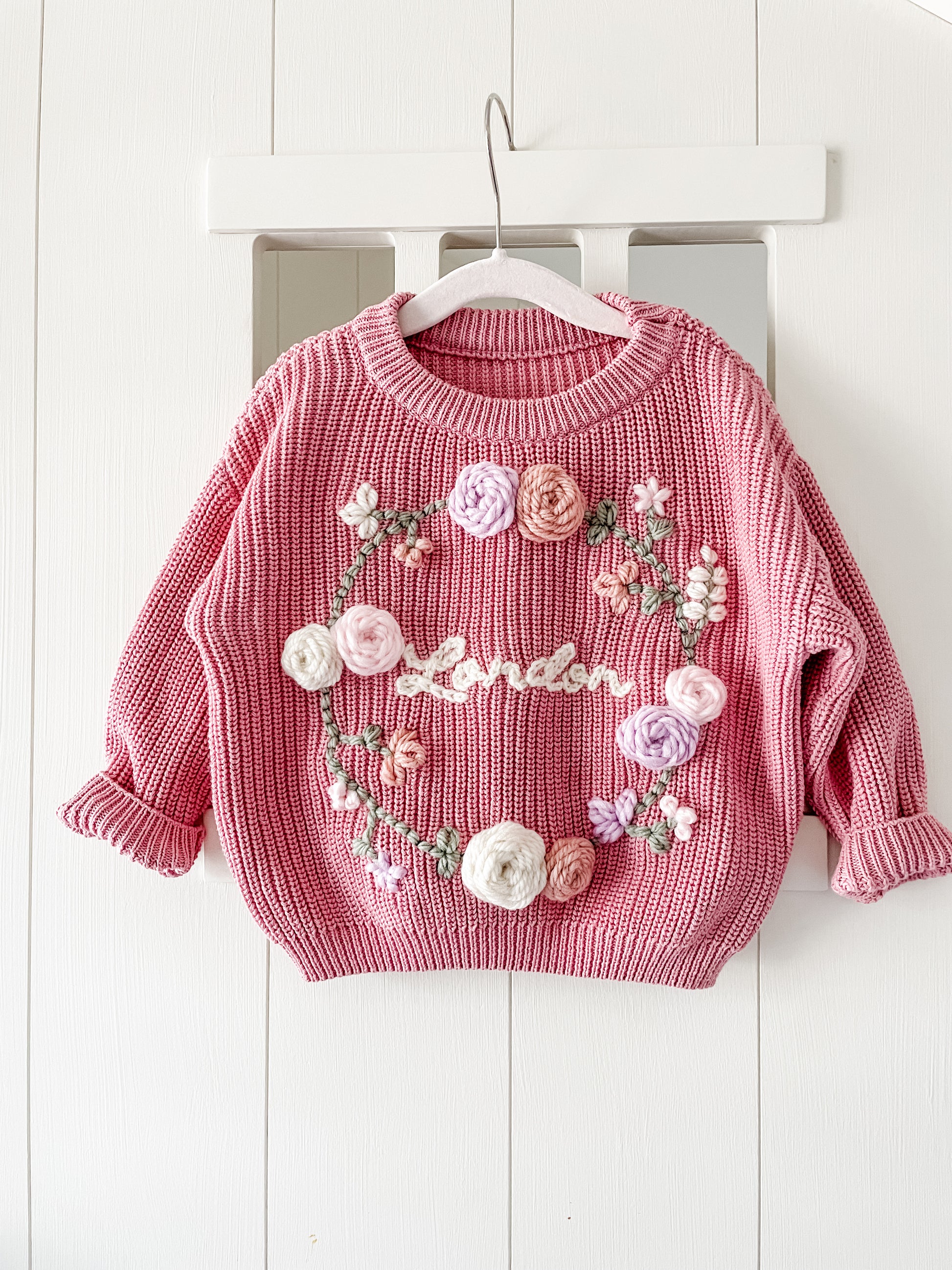 This sweater is hand embroidered in cursive with a floral wreath circling the name. This item is handmade and unique, and as such any small imperfections are a part of its charm.