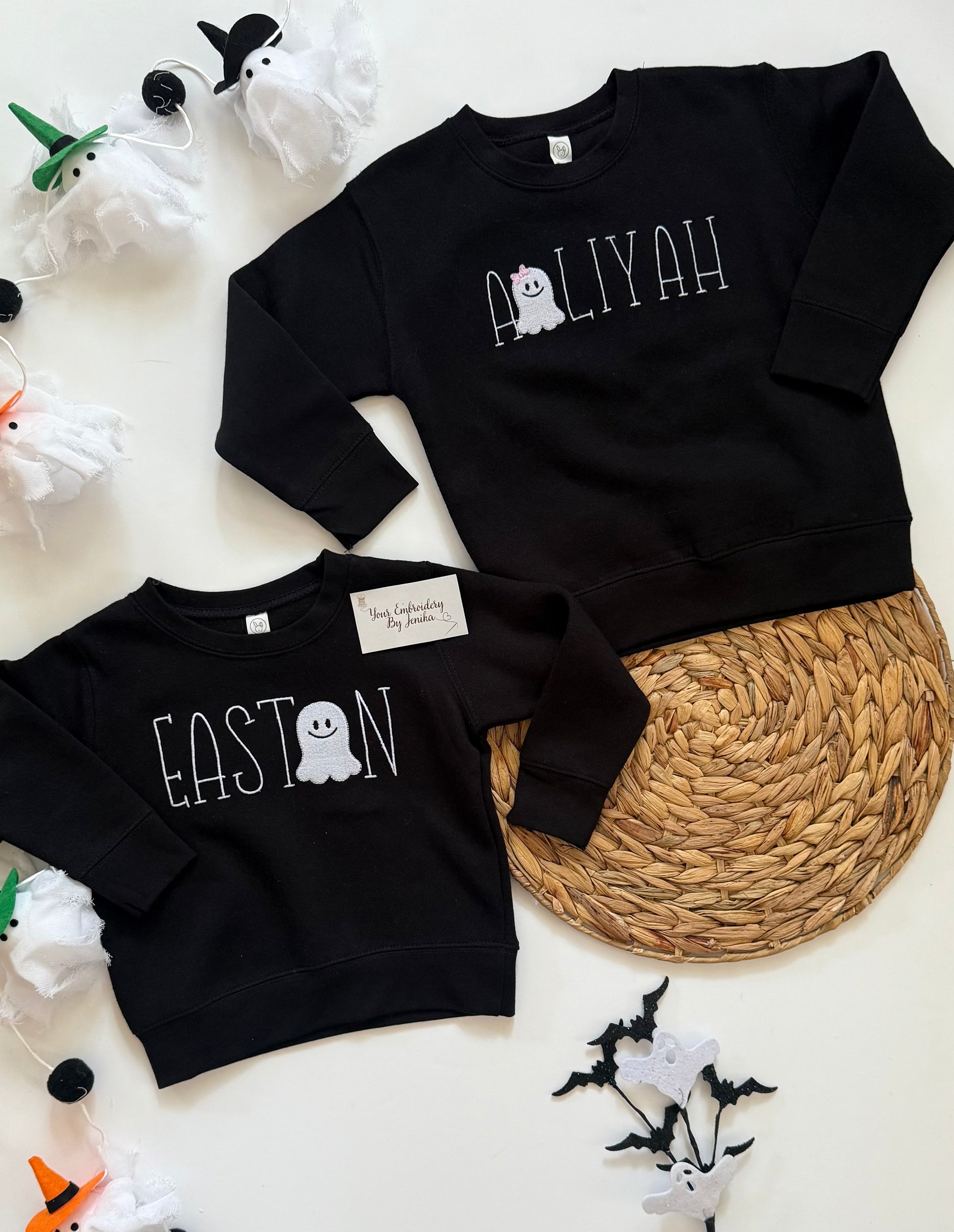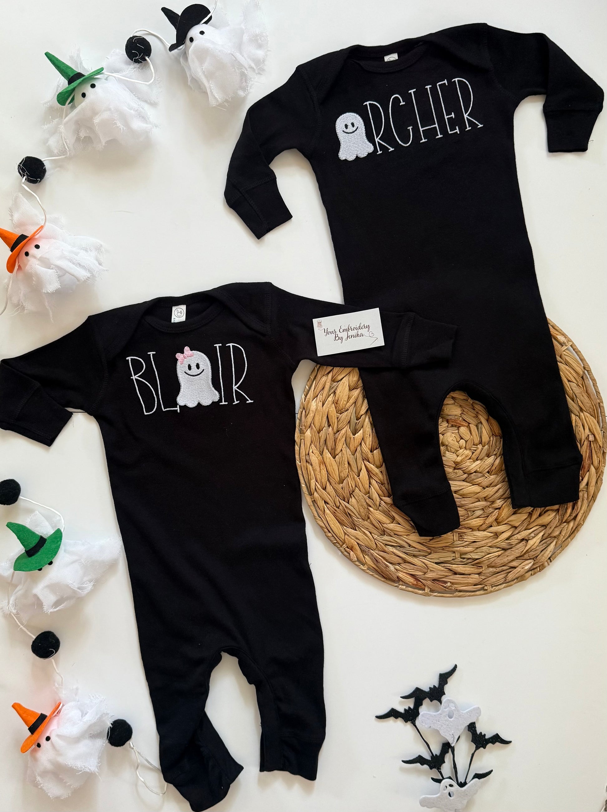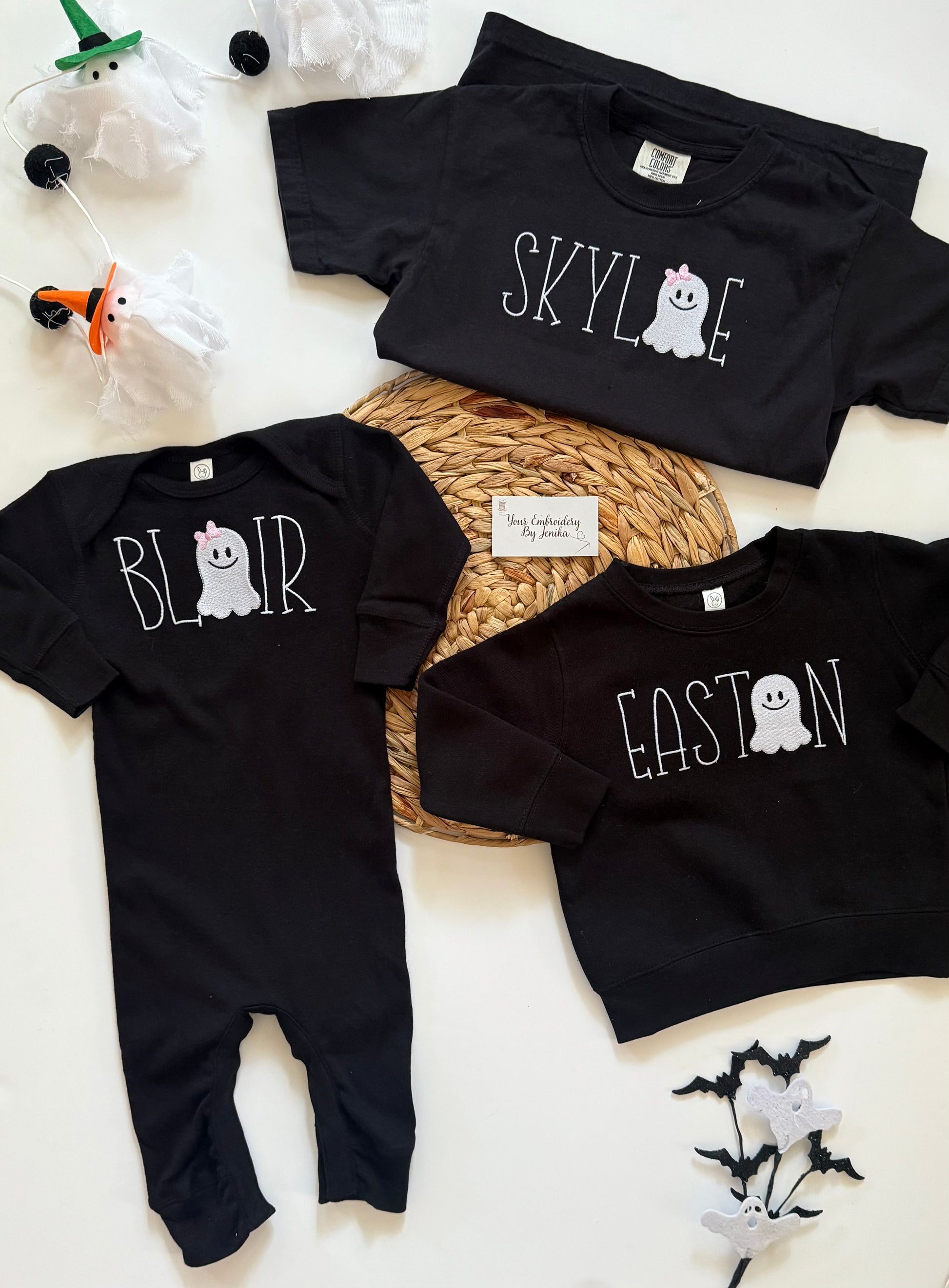 Get your child ready for spooky season with a personalized glow-in-the-dark ghost tee, sweatshirt, or onesie! Each top is embroidered with bright white glow-in-the-dark thread so their name lights up when the lights go down.